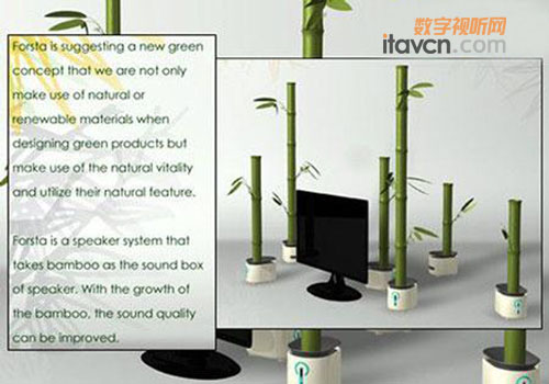 Forsta采用了純天然的竹子制成,栽在花盆內,只要為它澆水,給它陽光,Forsta便會長大。Forsta竹子音箱的揚聲器嵌入在竹子的斷層內,同時調節旋鈕設在了花盆上。