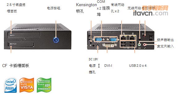 媒體內容最高可支持 480P/720P, 具有彈性擴充能力;MiniCard 插槽 x1 可選擇安裝 802.11b/g/n 無線網卡或電視調頻;高可靠度,可適合各種市場應用;無風扇設計;RS232 x2,Giga-高速網絡 x2,USB 2.0 x4 19V 65W 變壓器,可選購 12V 電源套件