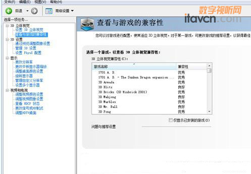 在"查看與游戲的兼容性"中,我們能夠看到3D Stereo支持的游戲列表,同時在"兼容性"一列中,能夠到對于游戲的支持程度。
