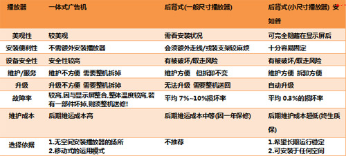 用戶在選購數(shù)字告示時(shí),常常會(huì)因?yàn)檫x擇過多而不知道如何判斷,除了要考慮到播放器本身的硬件性能外,仍有其他一些因素是很必要納入考慮范圍的,以下就目前市場主流產(chǎn)品,包含一體式廣告機(jī)、一般尺寸播放器、及安如普的輕穩(wěn)播放器三種進(jìn)行客觀性對比,選出了目前用戶主要關(guān)注的幾個(gè)因素:美觀性、安裝便利性、維護(hù)性、升級方便性、故障率、維護(hù)成本等進(jìn)行比較: