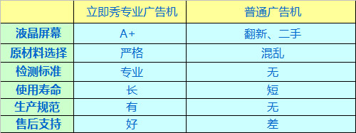 目前廣告機市場魚龍混雜,沒有相應的行業規范,入門門檻低,導致很多用戶往往重復購置廣告機,造成了不少的資源、成本浪費。而站在消費者的角度來考慮,肯定是希望選用有保障的品牌產品,而且價格還很合理。立即秀廣告機正是迎合了市場的需求,它堅持了品牌產品的質量和服務,同時價格絕對公道。市面上的多數廣告機廠商因為投資規模小,人員有限,而且多屬于短線收益的經營思維,所以不會做到品牌的規劃與服務,價格可能很低,但是品質無法保障 。