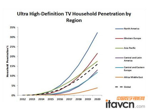 ·從超高清電視的家庭普及率角度而言,到2020年美國將超越中國成為全球領(lǐng)先的國家。按地區(qū)劃分,北美、西歐和亞太地區(qū)的超高清電視的家庭普及率分別為32%、22%和18%。