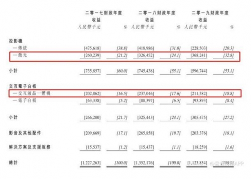 事實上,按從產品來看,激光投影機和交互液晶一體機及一體式電子白板的收入貢獻的確明顯提高,于總收入中的占比分別從2017財年的21.2%和16.5%,增長到2019財年的32.8%和18.8%。但是高毛利產品的出現并未能掩蓋投影機和交互電子白板整體收入下滑的跡象。
