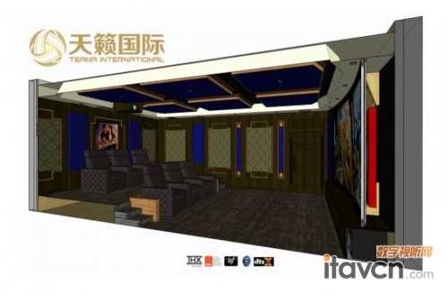 為了兼顧聲學處理的專業性與室內設計的藝術性。在影院裝飾設計上,美式大氣風格十分突顯,大膽采用略顯木質元素作為主色調,輔以冷色色塊組合,高落差的劇院式雙排座椅,打造一個雅致舒適,融合高端視、音頻、智能科技,聲學規劃,人體工學等于一體的高檔私人視聽空間。