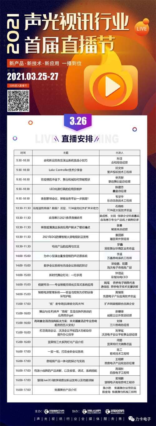 【數(shù)字視聽網(wǎng)訊】2021年3月25日,聲光視訊行業(yè)首屆直播節(jié)隆重開啟!為期3天!