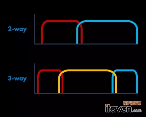 要將分頻點控制限制降低到頻率的一半,喇叭的寬度應為兩倍。許多 QSC 屏幕通道型號的雙 15 英寸堆疊低音揚聲器具有良好的覆蓋模式,可與低至 300 Hz 左右的 90°x50°號角匹配。三分頻影院揚聲器以大約 300 Hz 和 2 kHz 的頻率交叉,以允許大中音喇叭再現大部分人聲范圍。這就可以再現卓越的對話清晰度,即使坐在房間的后面聽起來也是如此的效果。