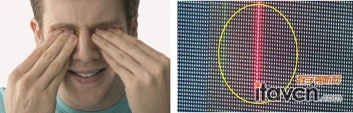 在PM被動驅動方式下,燈珠是逐行亮滅的,一個小的顯示區域里,同一時間只有一行燈珠是亮的,其他行燈珠都是滅的。這就好比用一支激光筆快速、反復掃過你的眼睛,太快了,以至于你認為是常亮的,并且燈珠的瞬間峰值亮度可以達到感官亮度的數十倍,所以你會感覺很刺眼,即使LED屏的亮度調得很低。