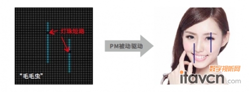 如果有1顆燈珠損壞短路,就會導致整行或整列的燈珠常亮,俗稱“毛毛蟲”。