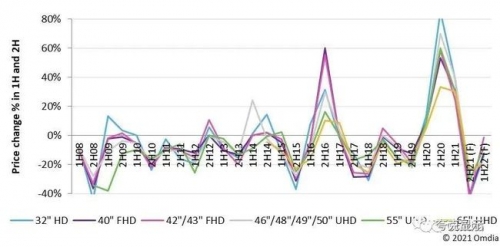 圖2:2008-2022年上半年和下半年的面板價格變化,2021年7月更新