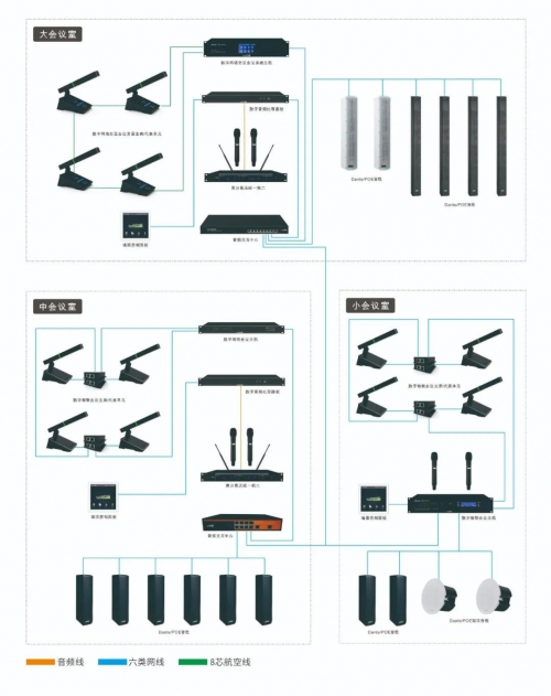 5.Dante數字物聯會議系統架構是什么?獨有的Dante系統架構可輕松組合并任意擴容不同廠家的設備,不受設備輸入輸出路數限制;可滿足很多復雜或大型系統長距離應用。可以滿足最苛刻的音響系統的要求,并且系統兼容性、靈活性、可靠性、擴展性非常好。