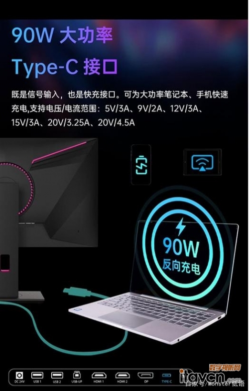 除此之外,這款新推出的顯示器對于筆記本用戶以及手機用戶表現(xiàn)友好,顯示器的背部擁有90W大功率的Type-C接口,除了可以給筆記本充電之外,還可以搭配C to C、C to Lightining的安卓、IPhone手機充電。
