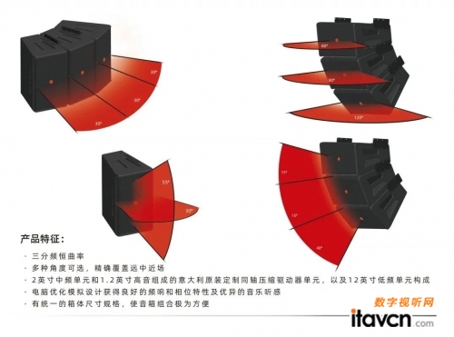 WINA系列恒曲率陣列音箱為獲得更平滑的頻響特性,采用中高音同軸單元,中低頻下限至400Hz;低頻單元采用高效率、大功率12寸低頻揚聲器單元,低頻下限低至55Hz,功率高達450W。
