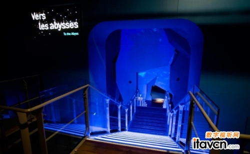 博物館希望通過在展區入口的樓梯間設置投影影像,來展現潛入深海的感覺。但由于空間場地限制,投影畫面只能顯示在藍色和灰色的墻面上,并且投影機需要足夠小巧,以應對狹小的安裝空間。這要求投影機需要有輕巧機身、短焦投射比、高亮度與高對比度。