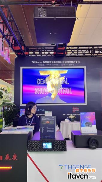 展位上的另一個吸睛展項是7thSense高質量媒體解決方案。前段時間在網絡上引起大眾熱議和好奇心的拉斯維加斯巨型LED球,直徑為157米,內部可容納18600個觀眾席位,其內外球面LED顯示屏都采用了7thSense公司的媒體服務、像素處理和表演控制技術,其中內球面的顯示標準為16K*16k 12bit RGB 4:4:4。