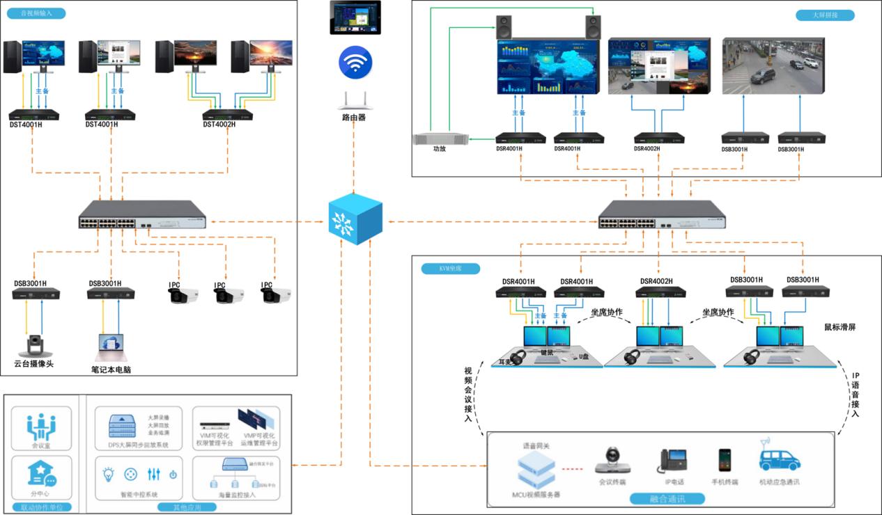 視通科技AS-ADS高清分布式顯控坐席解決方案,集成了音頻處理、視頻拼接處理、視頻會議處理、網絡傳輸、環境監控、KVM坐席協作及可視化控制等多種功能于一體。該方案采用嵌入式架構,確保了系統的穩定性與高效性,同時,其IP化、無中心化的設計,讓系統具備了前所未有的通用性和靈活性。