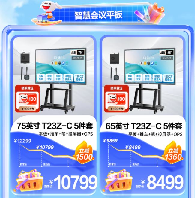 在此次雙十一促銷(xiāo)活動(dòng)中,風(fēng)尚版T23Z-C會(huì)議平板可謂“包羅萬(wàn)象”,力度空前。其中,65"/75"/86"T23Z-C會(huì)議平板搭配移動(dòng)推車(chē)、智能筆、投屏器配件組成“豪華四件套”,下單至高立減2120 !原價(jià)9859元的65T23Z-C會(huì)議平板豪華五件套(會(huì)議平板+移動(dòng)推車(chē)+智能筆+投屏器+OPS)到手僅8499元,86T23Z-C會(huì)議平板豪華五件套更是立減2440元 !活動(dòng)期間,曬單還送彩色打印機(jī)、京東E卡等精美好禮!