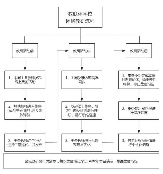 各教聯體學校本著“共建、共贏、共享”的原則,充分應用在線教研工具,打造常態化線上線下相融合的集體備課與聽課評課模式,并通過優化教研活動流程、提升異地同步教研效率,更好實現教學相長,進一步提升教聯體各校區教學水平和教育質量。通過本學期的應用,也初步沉淀出了網絡集體備課的開展范式: