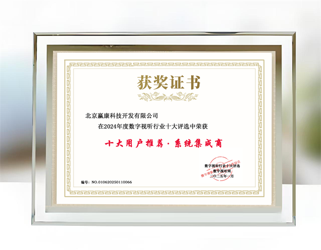 本次評選中,贏康科技還獲得了“十大用戶推薦集成商”獎,恰逢贏康科技20周年成立之際,這份獎項的意義也見證了行業對贏康的認可,不論是從方案設計、項目集成、安裝施工、綜合調試,還是媒體制作,贏康科技都以踏實務實的態度和嚴謹高效的工作作風,獲得了客戶們的好評。未來,贏康科技將繼續為廣大客戶與用戶提供優質的產品與服務。