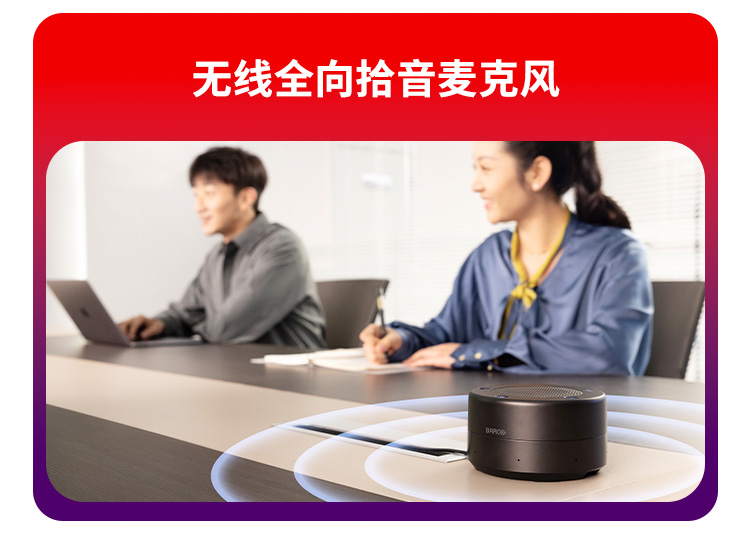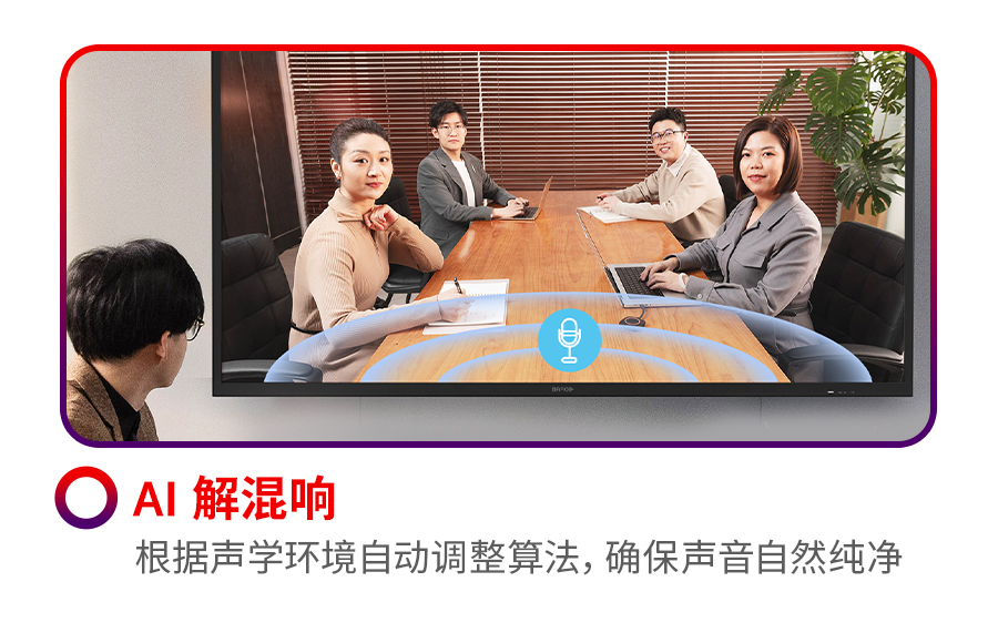 他介紹道,在視頻會議中用戶經常會遇到聽不清、看不清的痛點。可立享無線會議屏正是針對這些痛點而專門設計的高度集成化產品方案。它集專業的音視頻能力、顯示效果與BYOM于一體。搭載16陣列波束成形麥克風,12米遠距離拾音,具有單獨的硬件加速能力,以AI深度神經網絡算法加持,輕松應對遠距離拾音、噪聲、回聲、混響等聲學挑戰。使遠距離溝通如同面對面,即使在復雜的聲學環境也能從容應對。