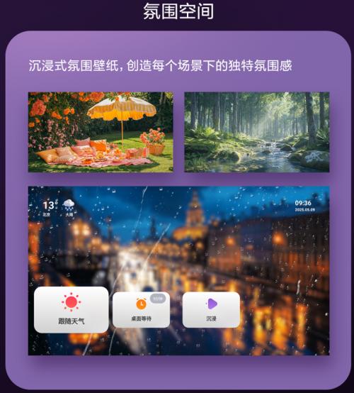 除了外置的氛圍燈,愛普生EF-51還內置了音樂、氛圍、觀影和日常管理等不同的空間模式。打開音樂空間,連接手機藍牙,投影機秒變音樂播放器,投影屏幕滾動的歌詞宛如隨樂流淌的光影詩句。氛圍空間分為活力、派對、輕松、浪漫、天氣五大模式,每個模式下又細分不同的場景。以天氣模式為例,選擇“下雨”,屏幕上出現動態的下雨場景,配合白噪音,令人感覺仿佛身處一個淅淅瀝瀝的雨天;選擇“跟隨天氣”,系統會自動定位,屏幕上的場景跟隨實際天氣變化。影院模式中有著海量的影視資源,影院級別的畫質足不出戶也能享受。日常管理空間則充滿生活氣息,用戶可以自由組合天氣、音樂、照片墻等小組件,滿足用戶生活記錄與展示的多元需求。此外,愛普生EF-51還擁有“喚醒”和“歸宅”功能。只需提前設定時間,EF-51便可為你喚醒一個美好的清晨,亦或是提前開啟氛圍場景,在夕陽中待你歸家。