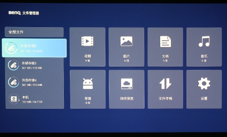 智能層面,明基W4100i在基于安卓開源系統的基礎之上進行二次開發,讓整個主界面保持干凈整潔,同時在系統內海嵌入了華數TV影視資源。