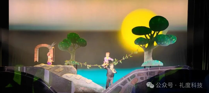 深圳禮度科技的技術團隊精心設計了投影光路,及設備安裝,使虛擬背景與實體木偶完美融合。觀眾可以看到熊先生在投影創造的森林中穿梭,在虛擬溪流中捕魚,在光影變幻的四季更迭中經歷冒險,這種創新表現形式大大增強了劇目的沉浸感和表現力。